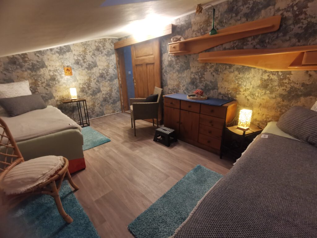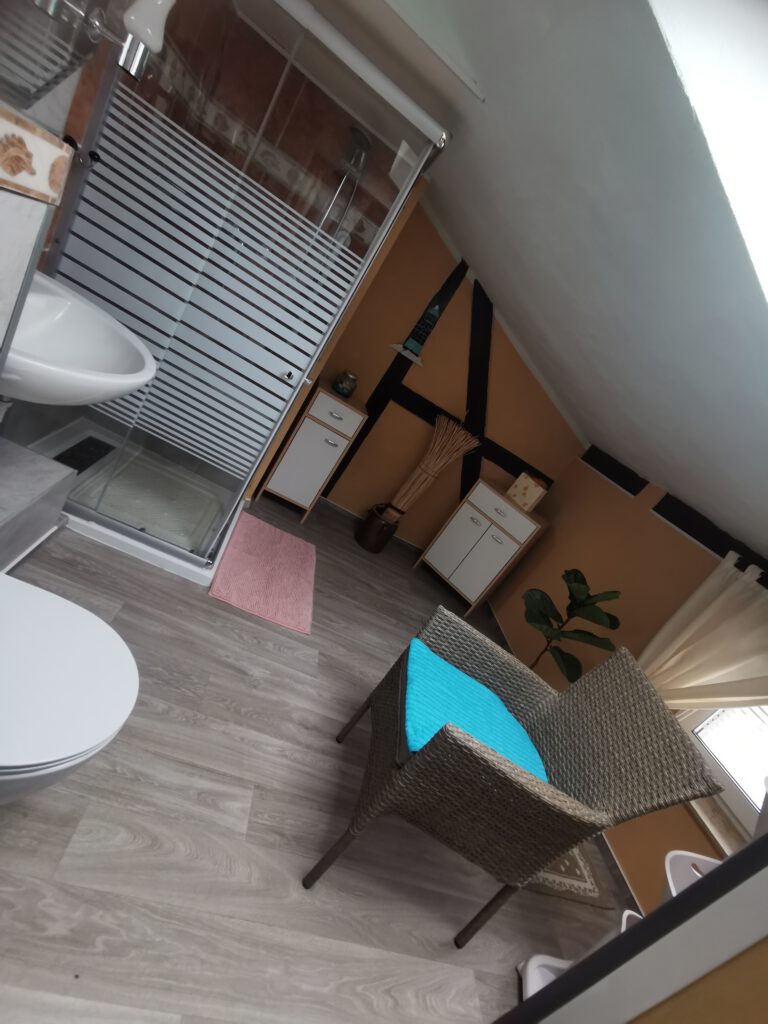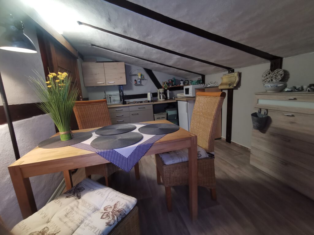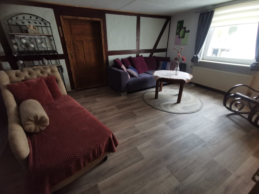 Sie nächtigen in einem alten Bürgerhaus, erbaut um 1884, zu großen Teilen aus Lehmfachwerk bestehend. In den letzten Jahren wurde es umfassend saniert. Der ursprüngliche Charakter in der oberen Ebene, konnte erhalten werden. Sie erwartet uriges Flair. Zugang per Treppe. Teilweise Dachschrägen und Lehmfachwerk. Es ist liebevoll und gemütlich eingerichtet und dabei herrlich unperfekt.